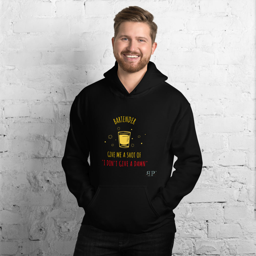 Whether you don't care what is in the shout glass or you are in "I don't give a damn" mood, this hoodie will surely warm you up between shots on those cooler nights.